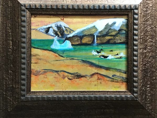 Orcas playing with iceberg. Framed. Gold leaf and India ink on board. 16 x 14